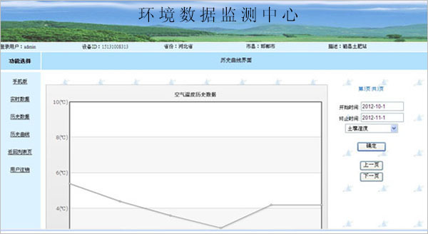 (2)左側(cè)為功能選擇鍵。分為“手機(jī)版”,“實(shí)時(shí)數(shù)據(jù)”,“歷史數(shù)據(jù)”,“歷史曲線”,“返回列表頁(yè)”,“用戶注銷”等功能。
