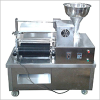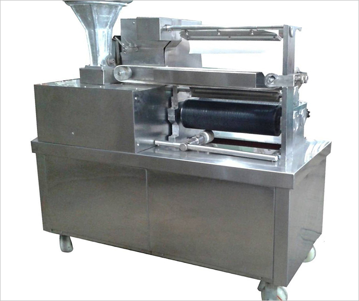 將煉好的合成藥料原料放入料斗,通過翻板翻轉(zhuǎn)擠壓,在推進器的作用下,藥條由兩側(cè)料嘴擠出。當藥條到達一定長度時,由自動切刀切斷,再由分配器以每秒一次的速度將藥條送入滾刀內(nèi)。滾刀的位置和輸送帶松緊可分別通過微調(diào)裝置進行調(diào)整,操作方便。