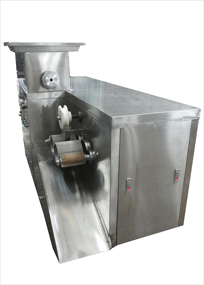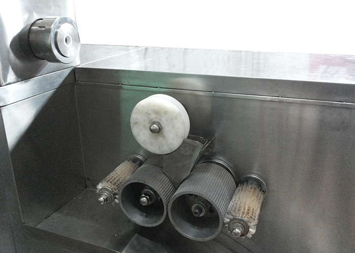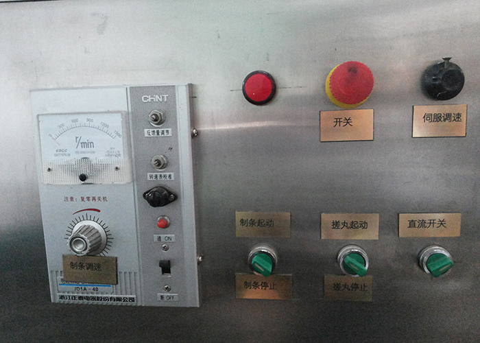 經(jīng)煉藥機(jī)煉制好的藥佗軟材,經(jīng)擠出擠壓成所需規(guī)格的藥條,經(jīng)過輸送條導(dǎo)送入制丸刀輪內(nèi),在制丸刀輪的切割和搓動(dòng)中連續(xù)制丸,性能穩(wěn)定,工作效率高。