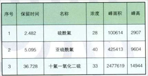 標(biāo)氣:SO2F2(硫酰氟):28ppm; S2OF2(亞硫酰氟):40ppm; S2OF10(十氟一氧化二硫):33ppm余:SF6(六氟化硫)